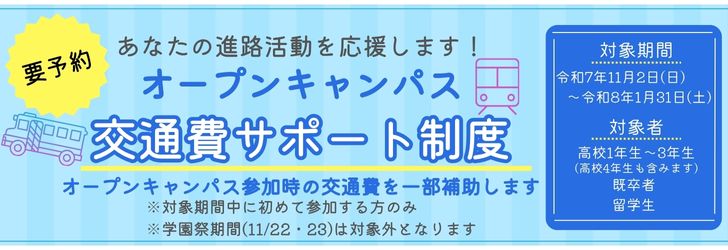 対象期間中にオープンキャンパスに初めて参加いただいた方に交通費の一部を補助します。